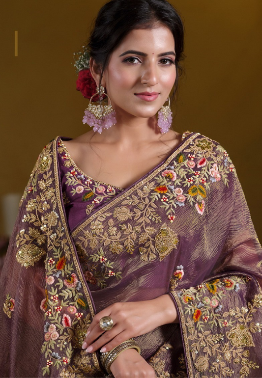 Tailored-To-Perfection Violet Banarasi Crush Silk Embroidery Saree