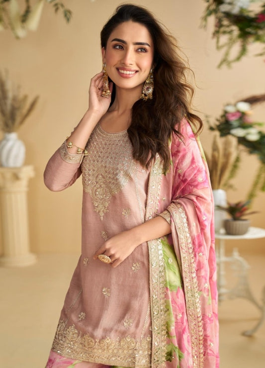 Understated Pink Heavy Chinon Pant Bottom Suit Set