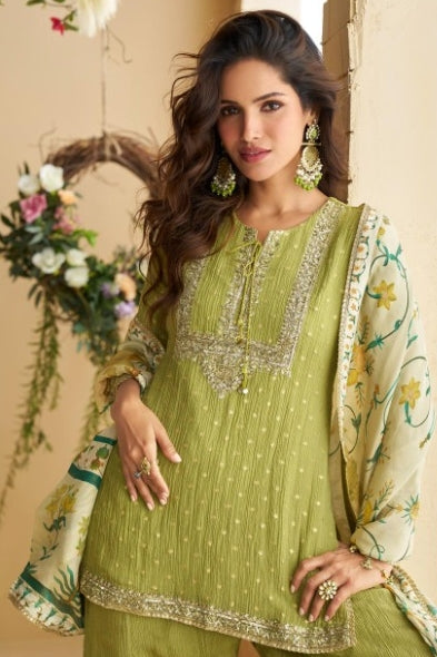 Opalescent Pista Green Chinon Silk With Embroidery Work Gharara Bottom Suit Set