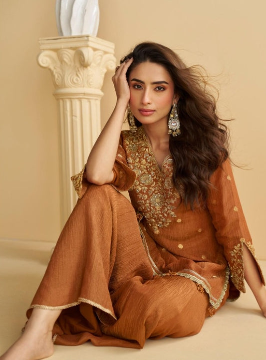 Luxe Brown Chinon Silk With Embroidery Work Gharara Bottom Suit Set