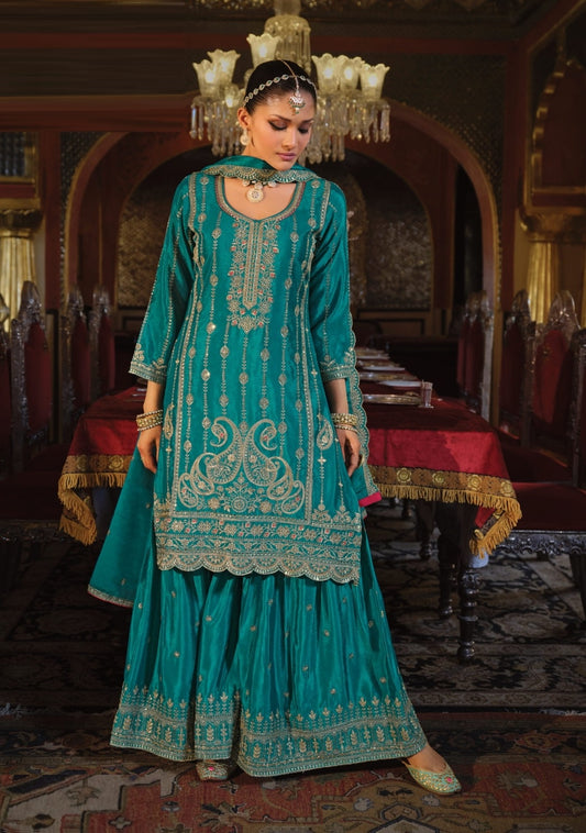 Contemporary Teal Heavy Chinon Pant Bottom Suit Set
