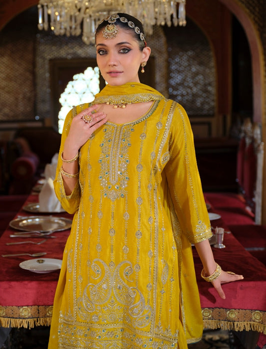 Breathtaking Mustard Chinon Silk With Embroidery Work Gharara Bottom Suit Set
