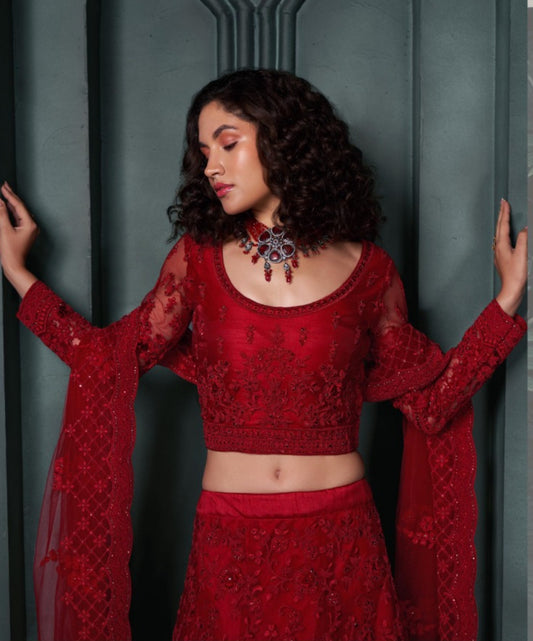 Couture Dark Red Net With Embroidery Work Bridal LehengaRegular price $168.00 USDRegular priceUnit price / per$168.00 USDSale price $168.00 USD