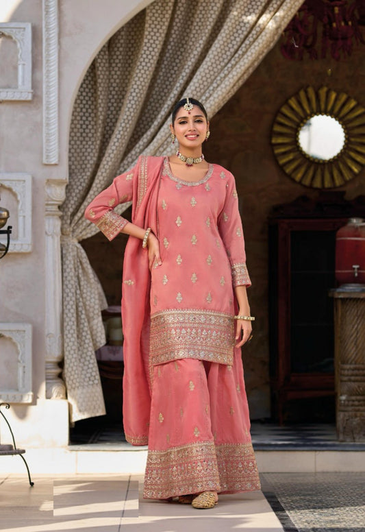 Classy Baby Pink Chinon Silk Palazzo Bottom Suit Set