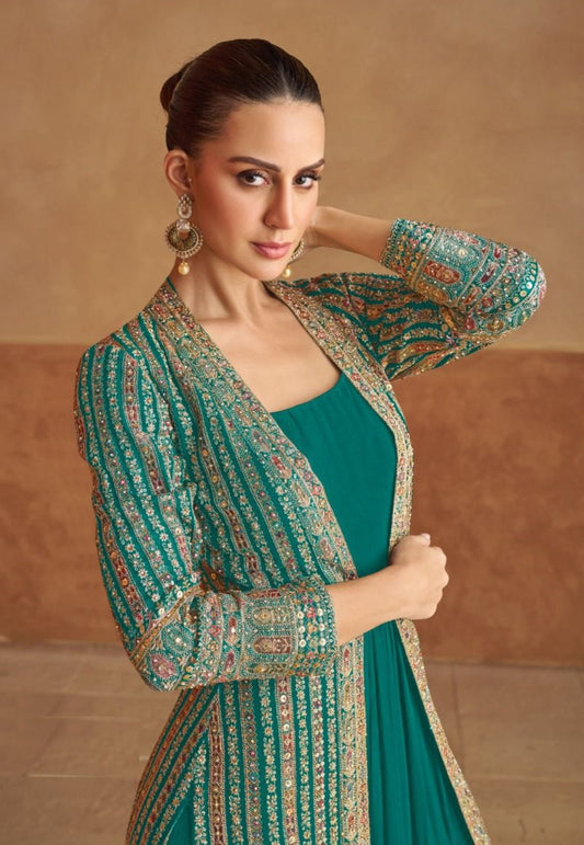 Women Teal Georgette Sequins Embroidery & Hand Work Gown With Jacket