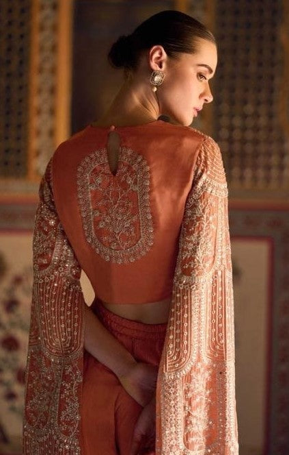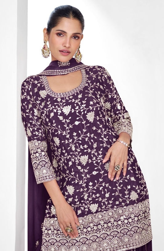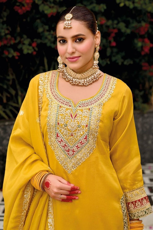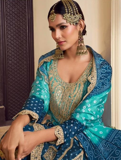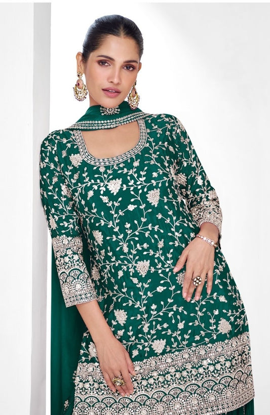 Women Teal Chinon Silk With Embroidery Work Palazzo Suit Set