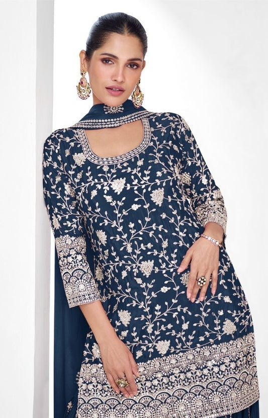 Women Navy Blue Chinon Silk Sharara Suit Set
