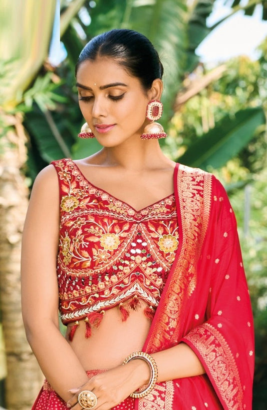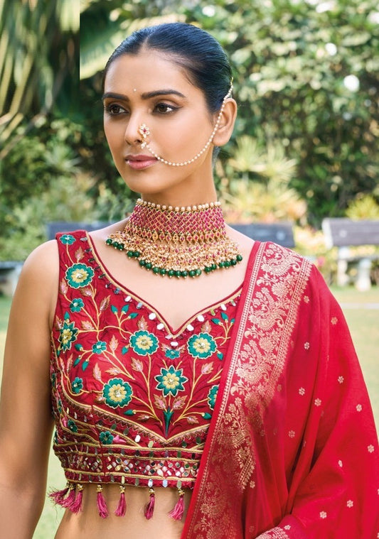 Beautiful Red Multi Silk With Embroidery Work Bridal Lehenga