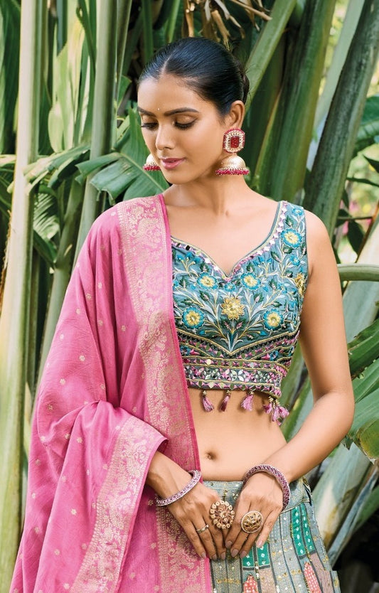 Amazing Grey And Blue Silk With Embroidery Work Bridal Lehenga