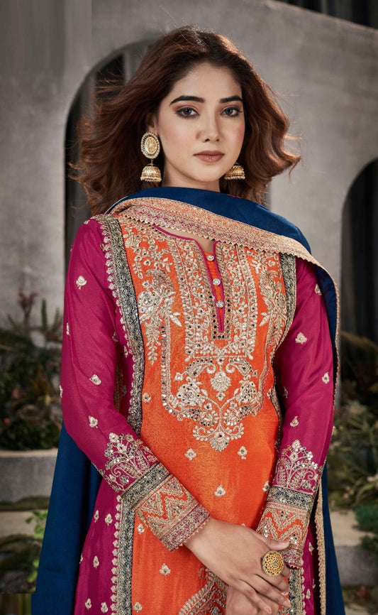 Couture Orange And Pink Chinon Embroidery Work Palazzo Suit Set