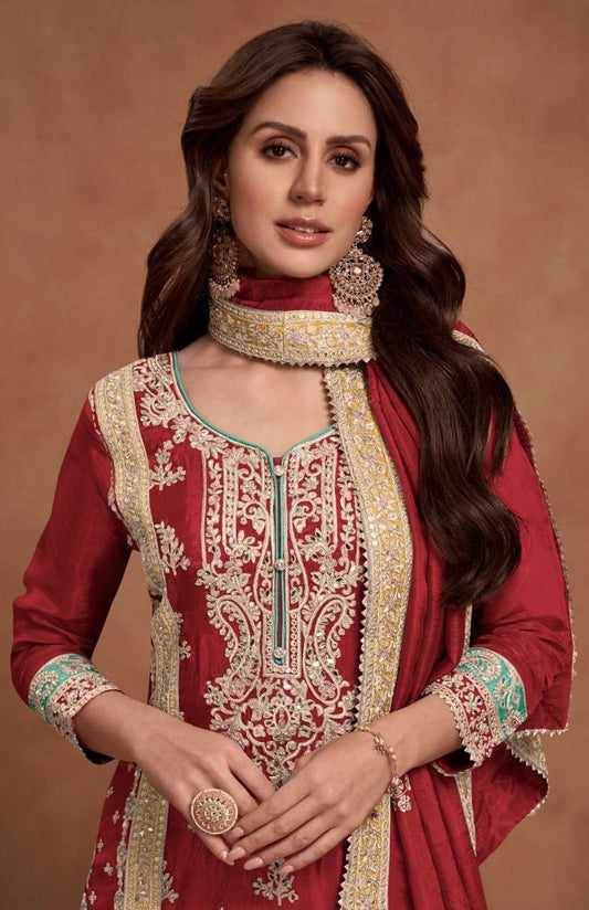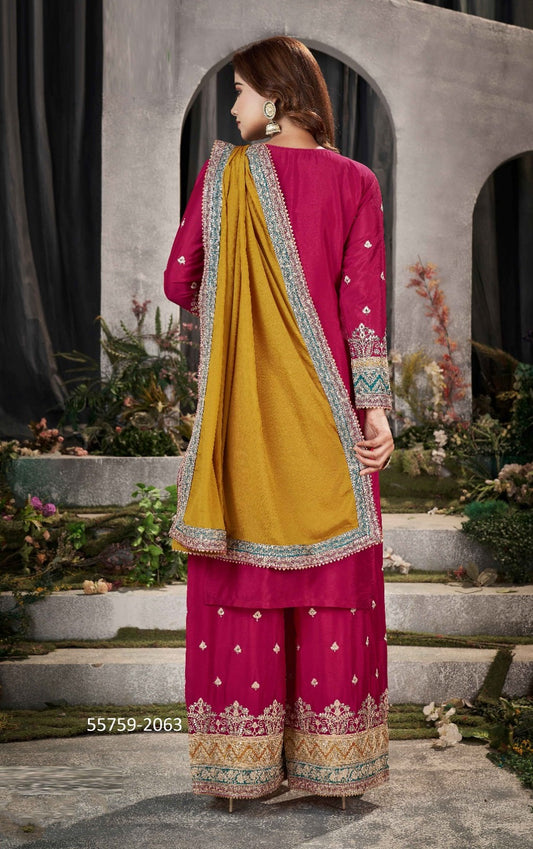 Beautiful Magenta And Teal Chinon Embroidery Work Palazzo Suit Set