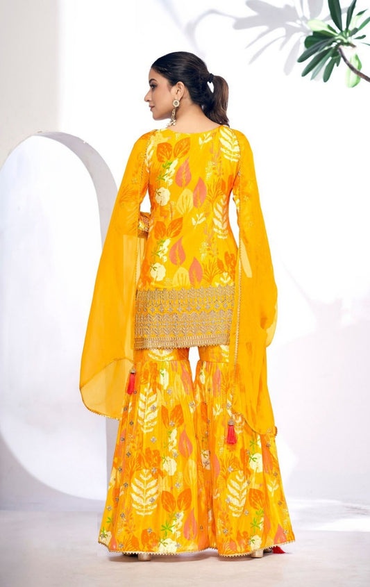 Immaculate Mustard Chinon Digital Print Gharara Suit Set