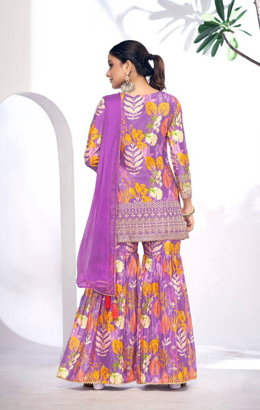Vivid Light Purple Chinon Digital Print Gharara Suit Set