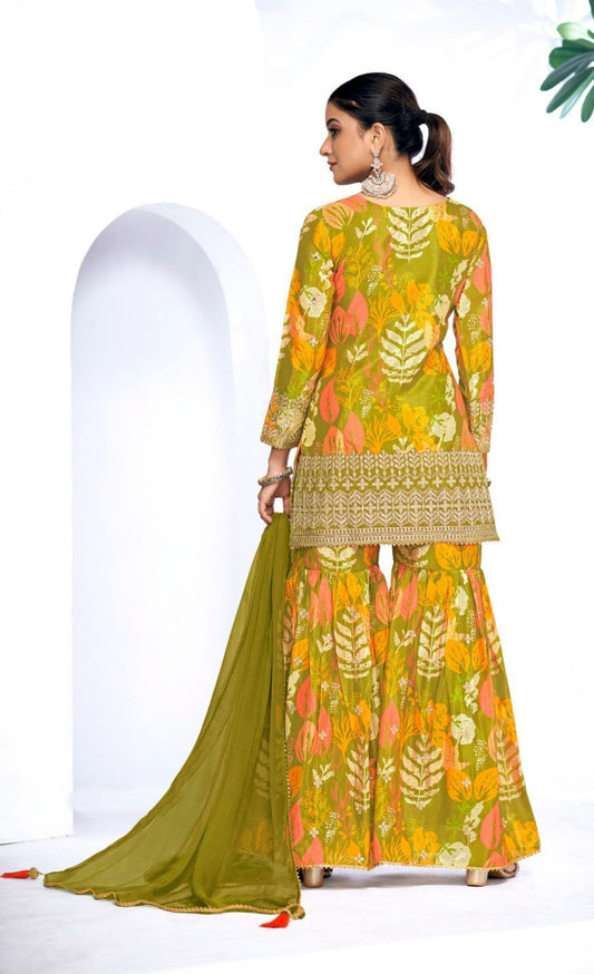 Enchanting Multi Green Chinon Digital Print Gharara Suit Set