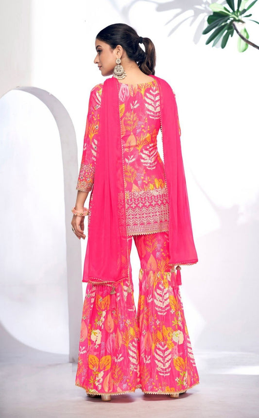 Sumptuous Pink Chinon Digital Print Gharara Suit Set