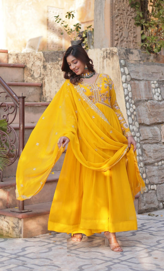 Women Yellow Georgette Embroidery Work Gown With Dupatta
