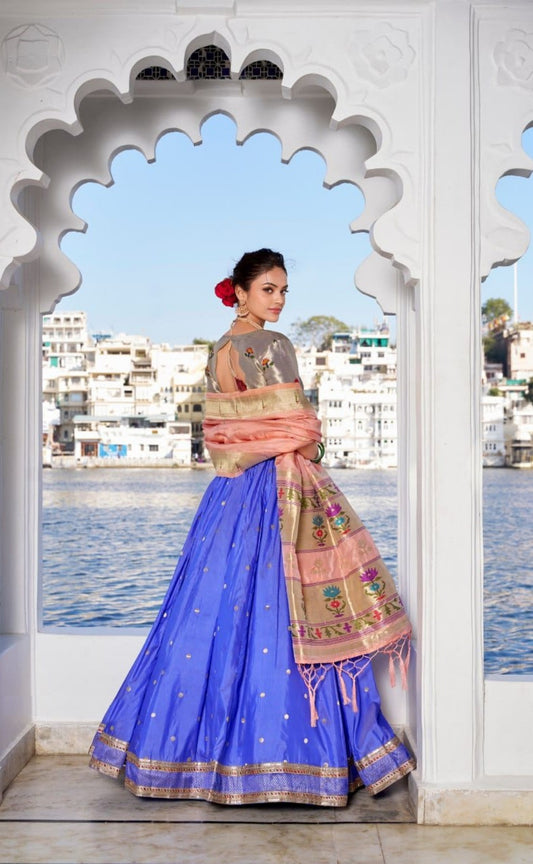 Dazzling Blue And Grey Jacquard Silk Paithani Silk Lehenga