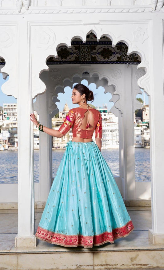 Glamorous Sky Blue And Red Jacquard Silk Paithani Silk Lehenga