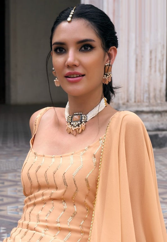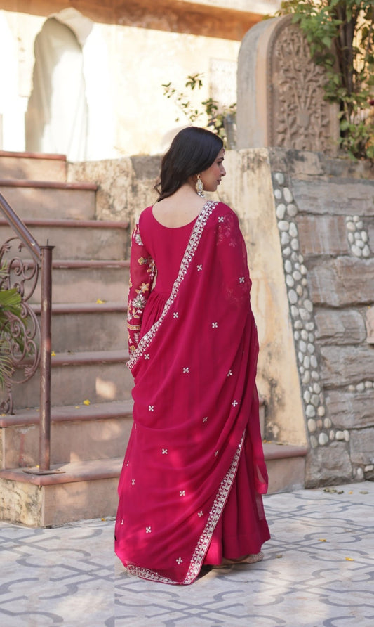 Women Pink Georgette Embroidery Work Gown With Dupatta