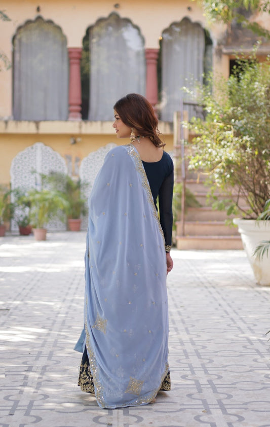 Dazzling Black Georgette Embroidery Work Sharara Suit Set