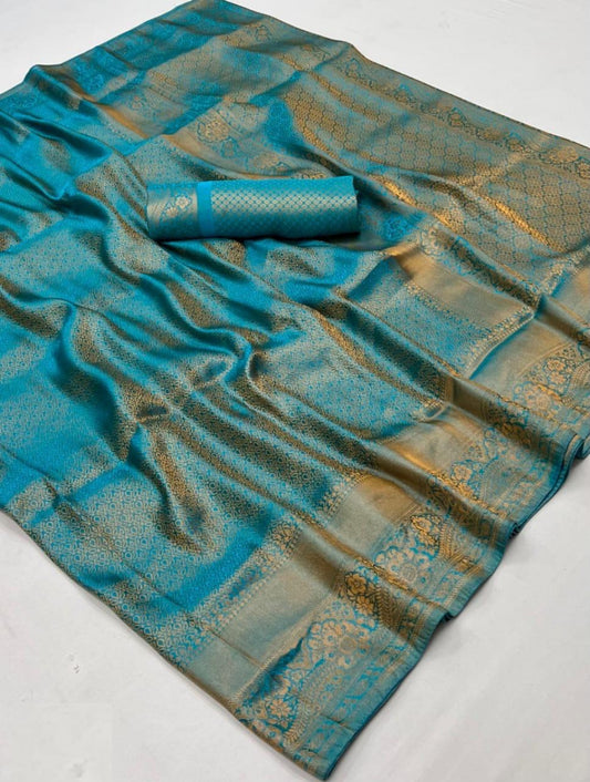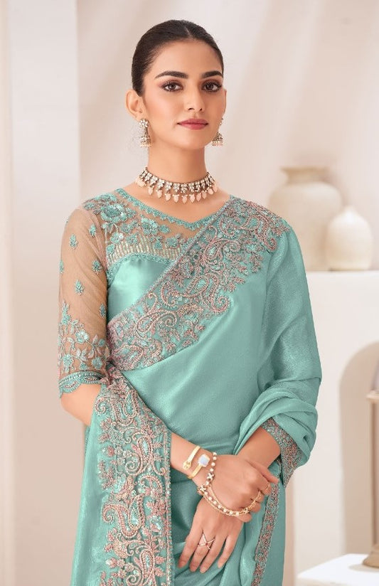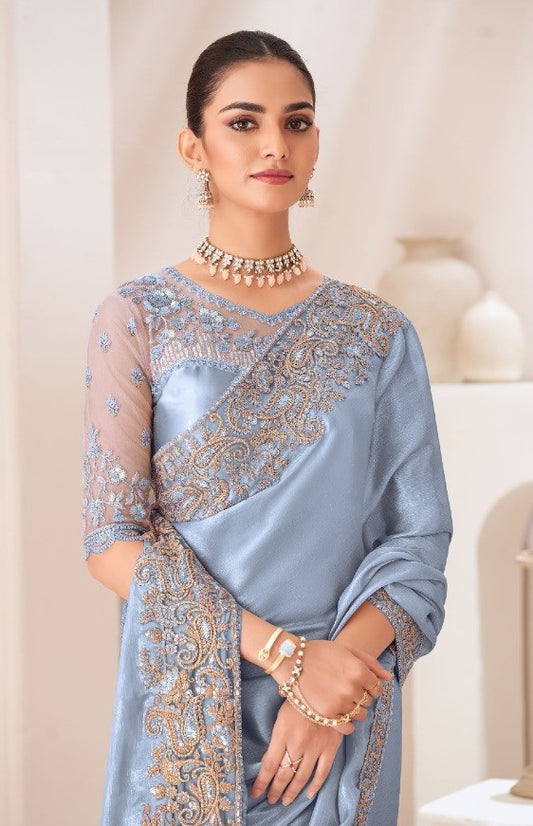 Trendy Sky Blue Satin Chiffon Boutique Style Saree