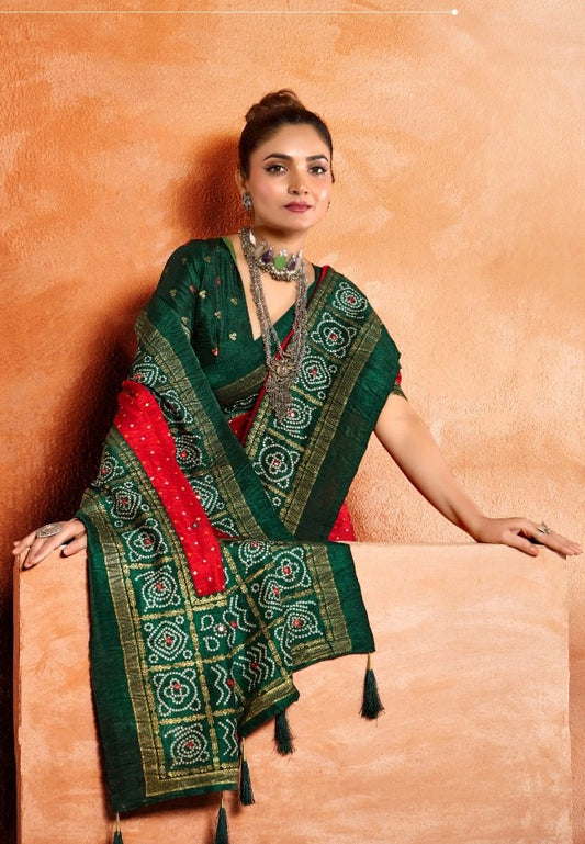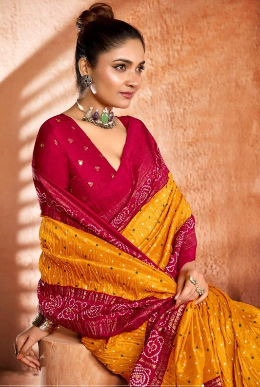 Tailored Mustard And Red Velvet Tusser Silk Saree