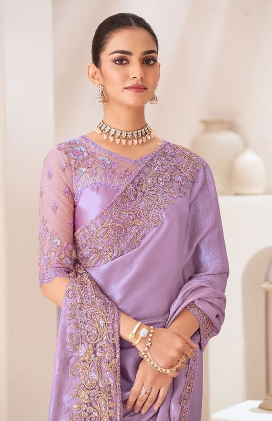 Glamorous Purple Satin Chiffon Boutique Style Saree