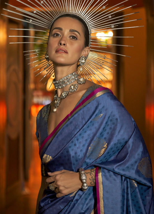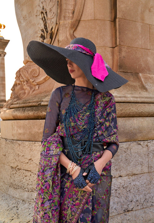 Magnificent Navy Blue Organza Handloom Kashmiri Saree