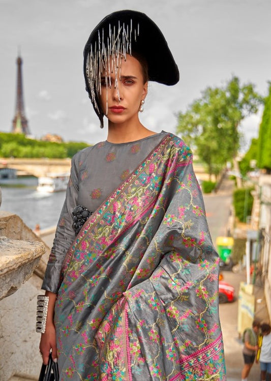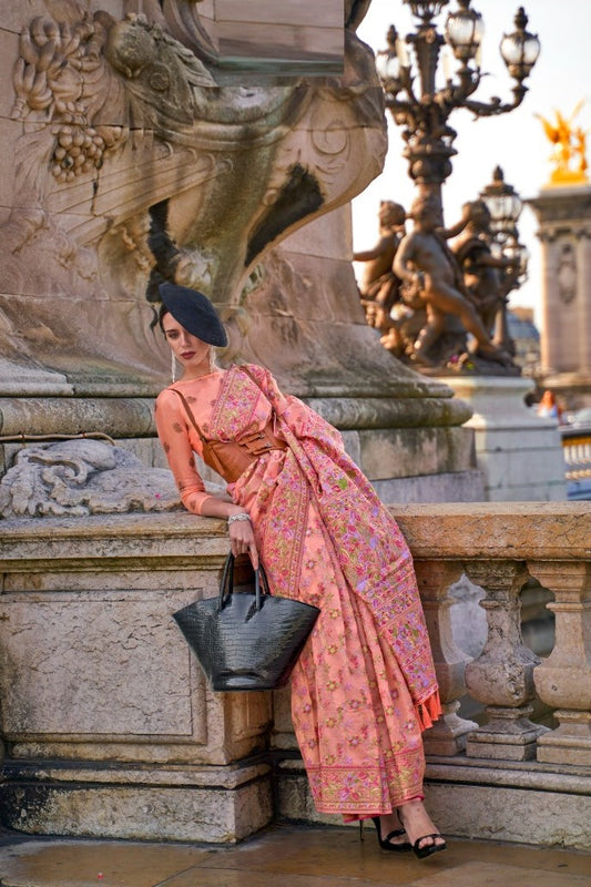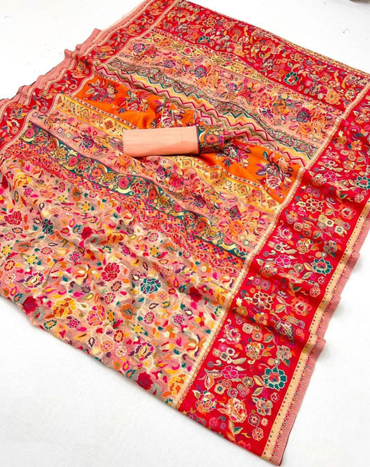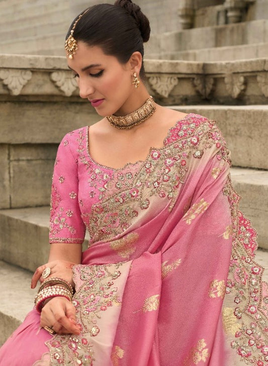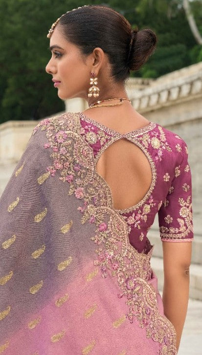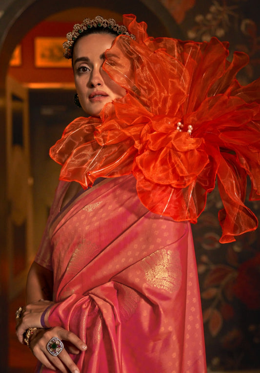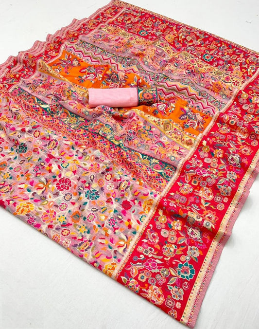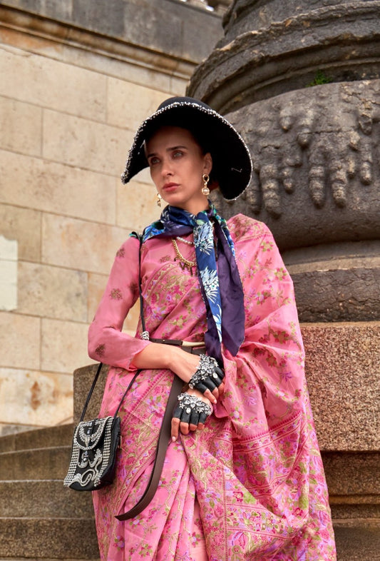 Breathtaking Pink Organza Handloom Kashmiri Saree