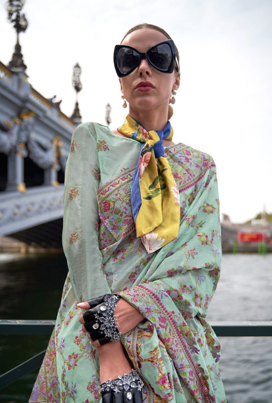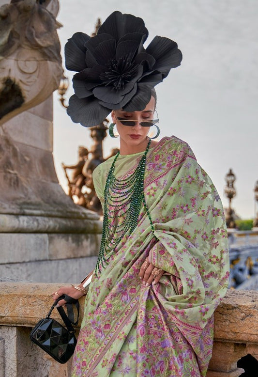 Exquisite Pista Green Organza Handloom Kashmiri Saree