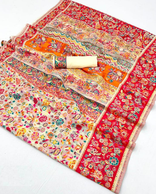 Beautiful Silk Off White Multicolor Kashmiri Saree