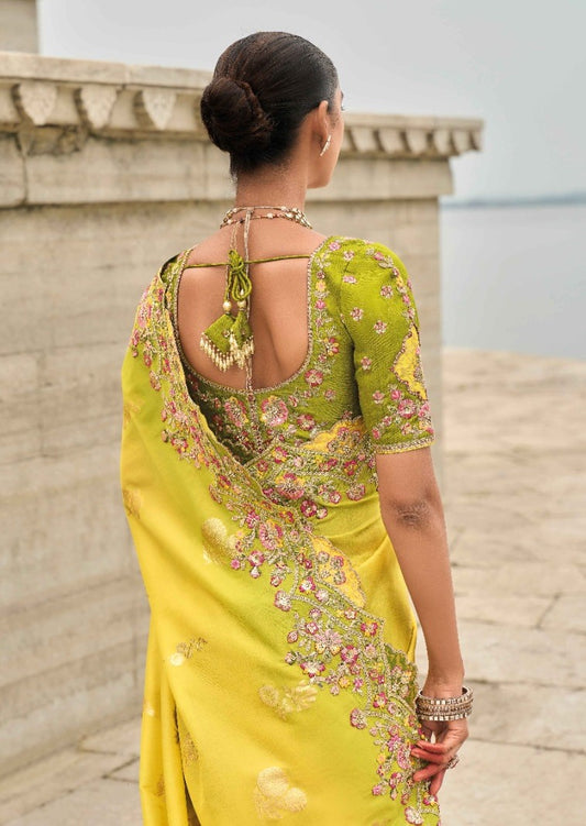 Elegant Yellow And Green Viscose Silk Embroidery Saree
