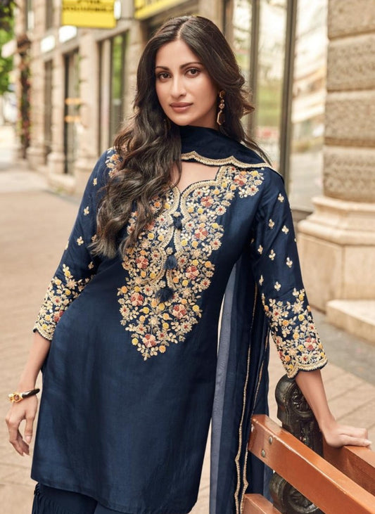 Navy Blue Silk Sharara Set With Dupatta