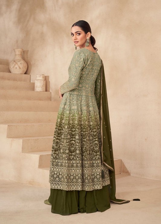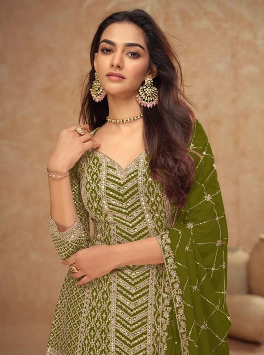 Women Georgette Mehndi Green Front-Slit Salwar Suit Set