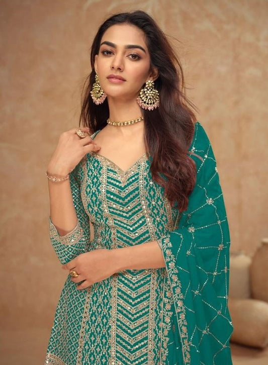 Latest Teal Chinon Palazzo Suit Set