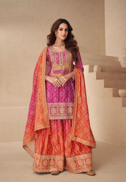 Women Pink And Orange Chinon Silk Palazzo Suit Set