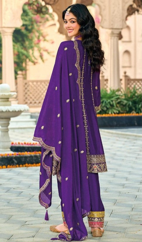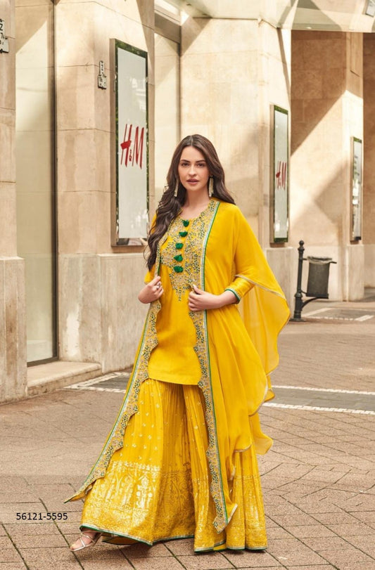 Fancy White Chinon Kurta Palazzo Dupatta Set