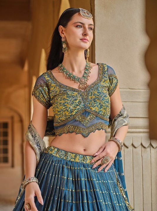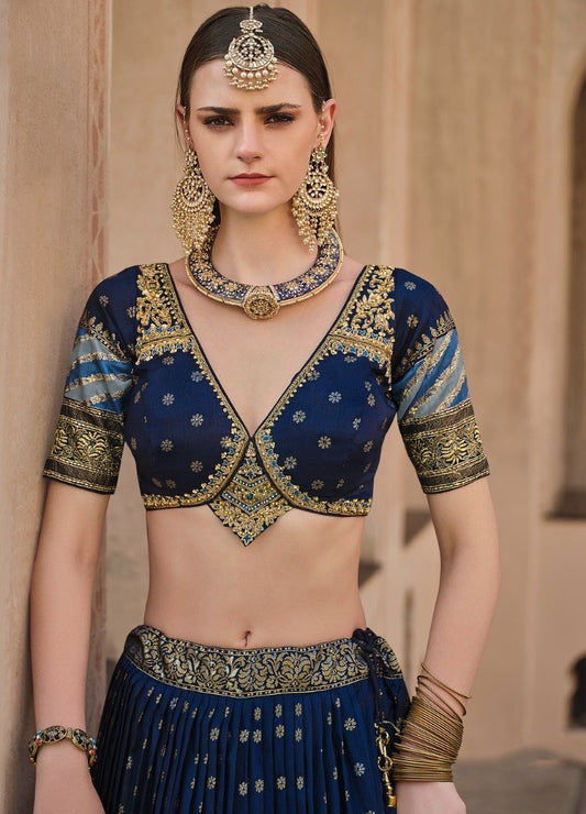 Royal Dark Blue Silk Foil Printed Lehenga Set