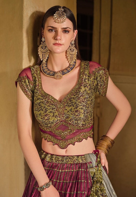 Traditional Foil Printed Burgundy Silk Lehenga Set