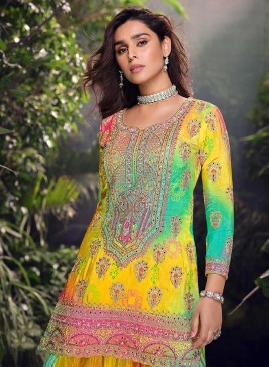 Multicolor Chinon Silk Sharara Set With Dupatta