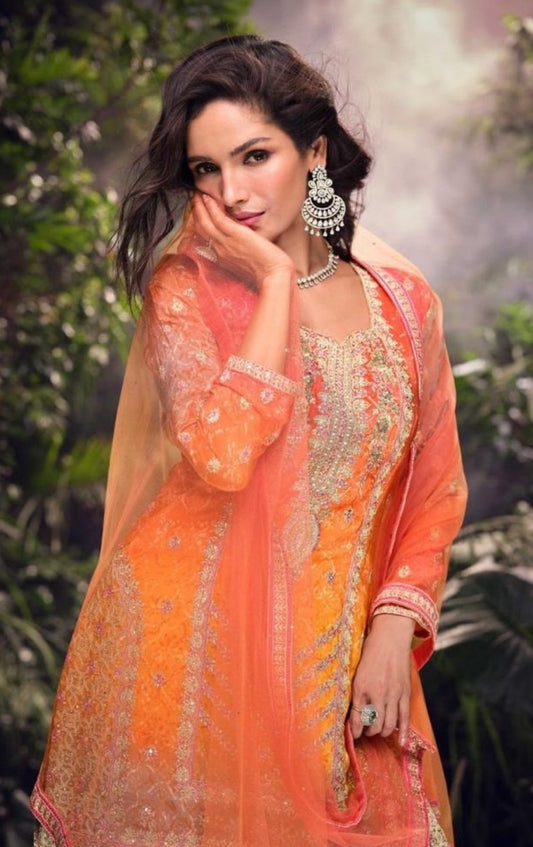 Orange And Coral Chinon Silk Sharara Set With Dupatta