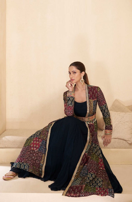 Hand Embellished Black Georgette Gown With Multicolor Shrug