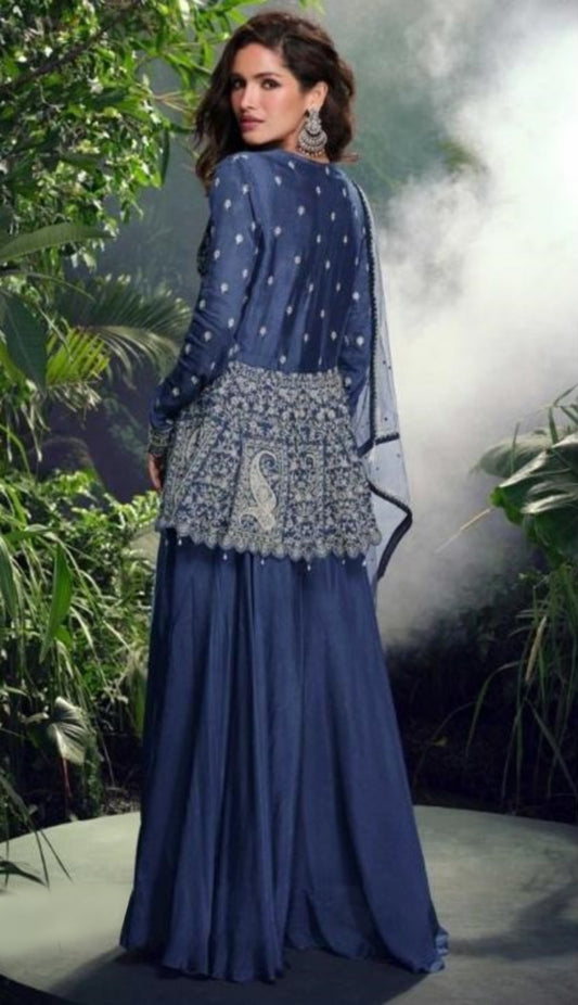 Fancy Blue Three Piece Gharara Set With Embroidery Work
