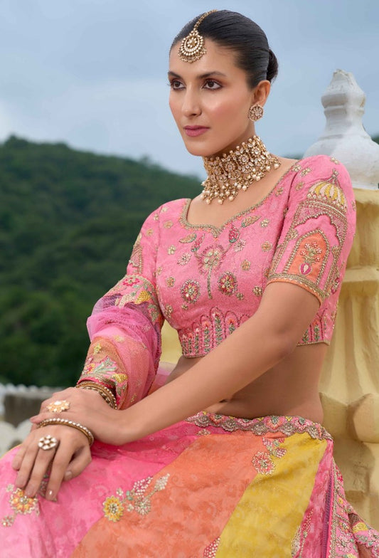 Pink And Yellow Silk Bridal Lehenga With Embroidery Work