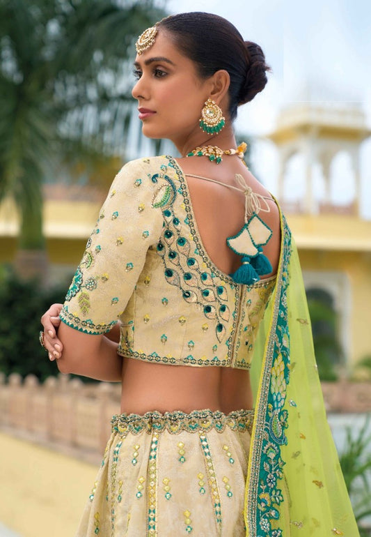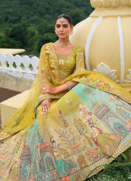 Embroidery Work Green And Blue Silk Bridal Lehenga