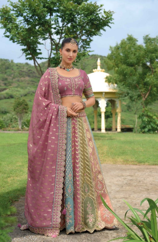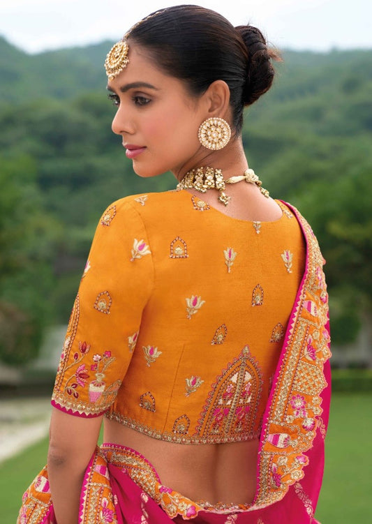 Designer Orange And Pink Silk Bridal Lehenga With Embroidery Work