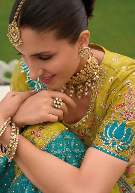 Women Yellow And Blue Silk Bridal Lehenga With Embroidery Work