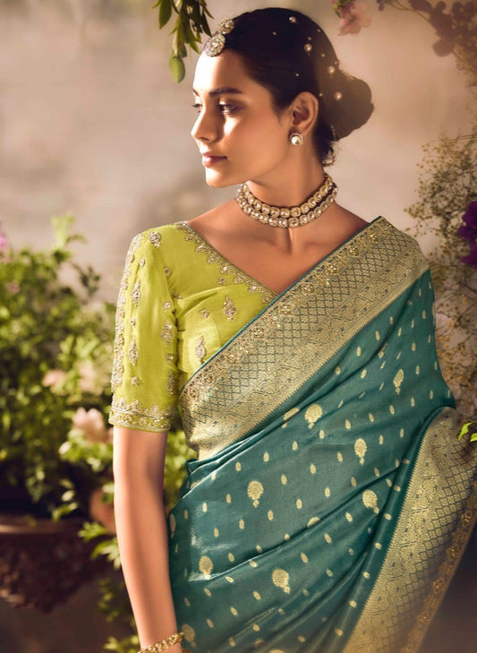 Trendy Teal Pista Green Banarasi Embroidery Saree
