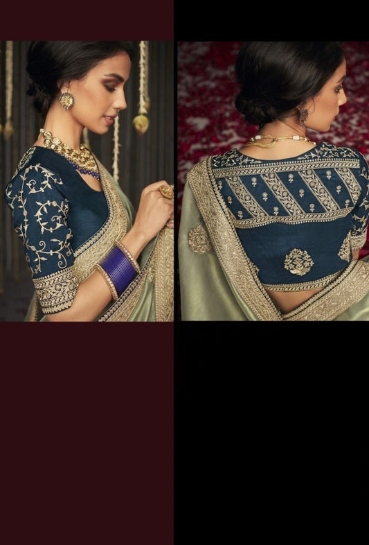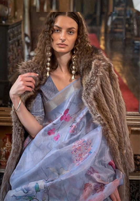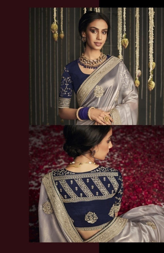 Designer Grey And Blue Organza Silk Boutique Style Saree