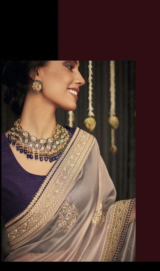 Fancy Peach And Purple Organza Silk With Embroidery Work Saree